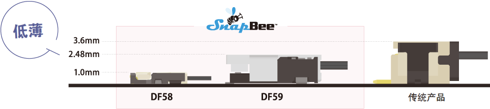 支持28 AWG,高度1.0mm,是業(yè)內(nèi)最低薄級別的小型連接器。DF58系列是SnapBee中在低薄構(gòu)造和窄間距方面最具優(yōu)勢的產(chǎn)品,有助于實現(xiàn)機(jī)器設(shè)備的小型化。較大的有效嵌合長度可以實現(xiàn)穩(wěn)定的連接。